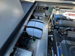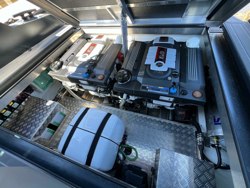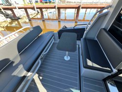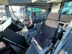 The helm and passenger helm chairs are independently suspended to offer a smooth and Vibration free ride for both the helm and crew. Aft of both helm and captain chairs is a large sofa to port that easily folds down to a large double bed. One can relax enjoy a pop up TV built into the counter space on the starboard side along with a large stainless fridge and electric cooktop and sink
