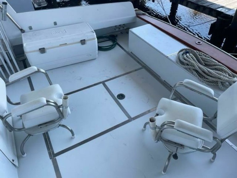 The helm station is on the centerline with a two-person bench seat to port and a single helm seat for the captain. Aft of the companion seat is a wet bar with built in U-Line icemaker. There is an L-shaped settee located aft and to starboard with a large coffee table. The entire bridge deck is air conditioned. Access to the cockpit is through a door on the port side aft.