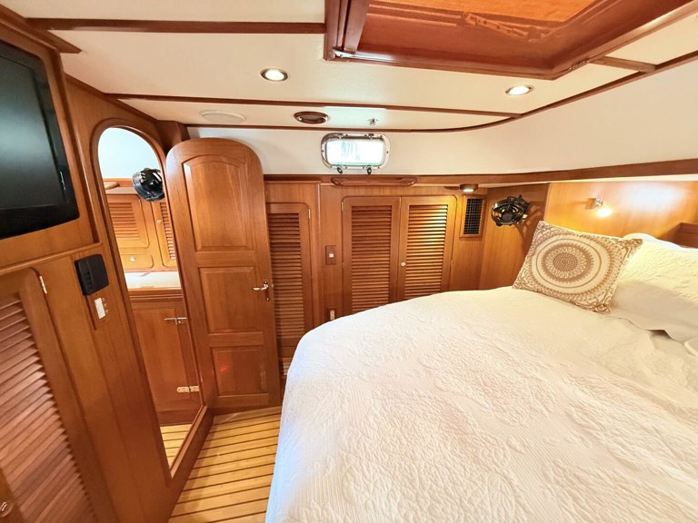 When you enter the companionway from the center cockpit, you will instantly be impressed with the space with its lavish headroom, the light from the cabin windows, and the beautiful teak joinery. Hylas elegance abounds with the unique curves and rather sumptuous layout with the curved dinette to port and settee to starboard with cabinetry outboard. The dinette has a pull out bench seat that allows generous comfortable seating for six at the salon table. The circular dinette table also lowers to make a nice double berth for visitors. The bamboo cabin sole is varnished in high gloss and has been protected with lovely carpets that compliment the custom upholstery. The numerous hatches have Ocean Air screens and blinds in the fore and aft staterooms. The quality and luxury is apparent and you will appreciate the attractive appointments from the high quality fixtures to the lighting complete with dimmers and reading lamps. The creature comforts are complete with a CruiseAir AC system with two compressors and the entertainment system with Flat Screen, DVD, CD changer and Alpine stereo sound system, Washer Dryer, Watermaker, Electric Winches, virtually everything you could need or want!