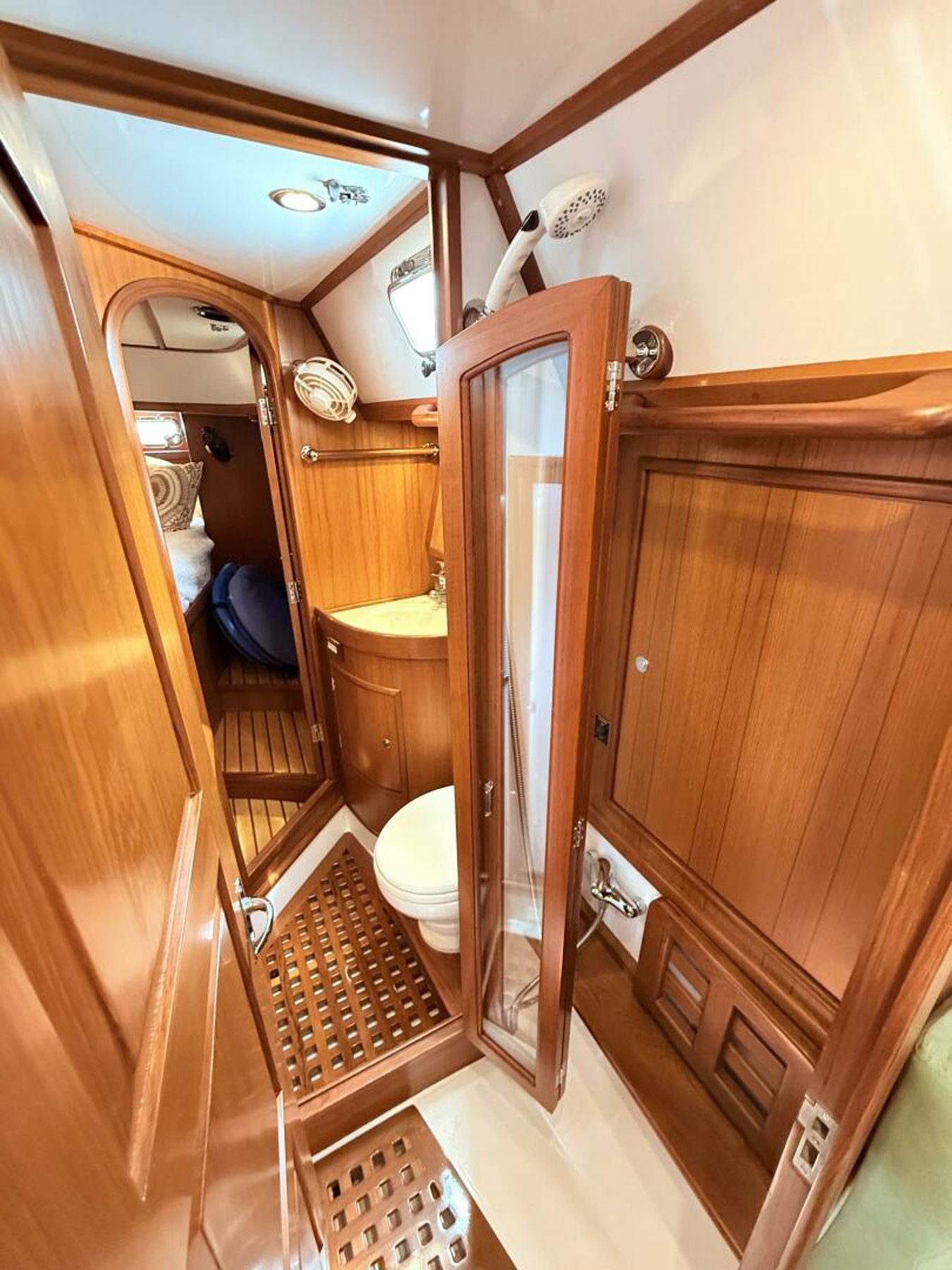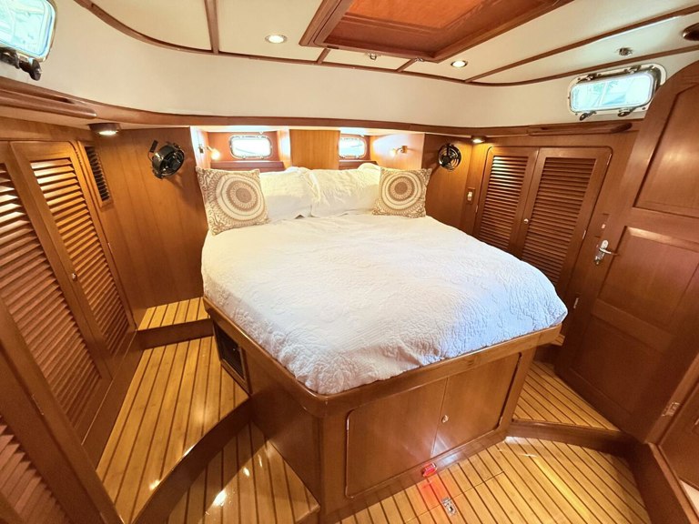 AccommodationsThe Hylas 46 has a beautiful center cockpit layout with that wonderful aft owner’s private stateroom and ensuite head and shower and an incredibly lovely pullman berth stateroom on the port side and the large head forward for guests. The walkthrough galley to starboard is classic and it works! Offshore it is safe and secure and at anchor the incredible counter space is welcome. The navigation station is forward facing on the port side facing forward with all the electronics beautifully mounted within easy reach. The salon and the entire interior is pleasing with varnished teak joinery and custom UltraSuede upholstery in a beautiful “willow” color. The cabin house has generous windows to create a light, airy and bright interior. Custom cabinetry provides ample storage and makes the vessel completely livable!