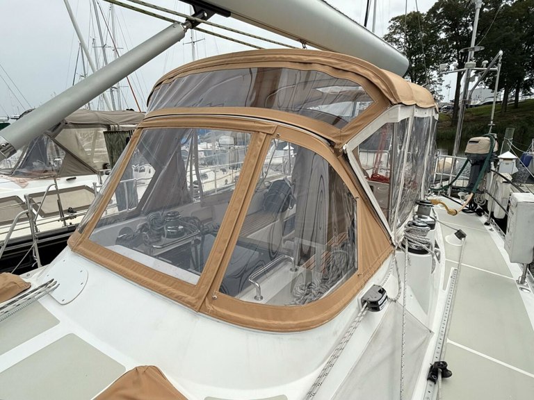 The center cockpit with its new dodger, new bimini and full enclosure extends the living space and the aft deck and swim platform becomes a lovely entertainments space as well.