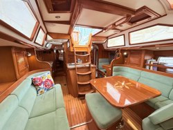 AccommodationsThe Hylas 46 has a beautiful center cockpit layout with that wonderful aft owner’s private stateroom and ensuite head and shower and an incredibly lovely pullman berth stateroom on the port side and the large head forward for guests. The walkthrough galley to starboard is classic and it works! Offshore it is safe and secure and at anchor the incredible counter space is welcome. The navigation station is forward facing on the port side facing forward with all the electronics beautifully mounted within easy reach. The salon and the entire interior is pleasing with varnished teak joinery and custom UltraSuede upholstery in a beautiful “willow” color. The cabin house has generous windows to create a light, airy and bright interior. Custom cabinetry provides ample storage and makes the vessel completely livable!