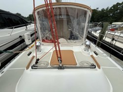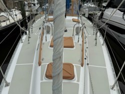 L shaped dinette seating on port side Salon table with removable leaf. Table can be collapsed and converted to a double berth. Starboard settee with cabinets 23" Samsung flat screen TV on electric motor mount behind starboard settee 2 hatches with screens Mast cover with locker Five upgraded reading lights, Two Hella fans, Red footlights, Handholds, Sirius, Alpine stereo speakers with separate volume control.