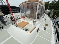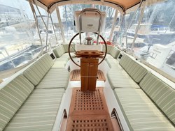The center cockpit with its new dodger, new bimini and full enclosure extends the living space and the aft deck and swim platform becomes a lovely entertainments space as well.