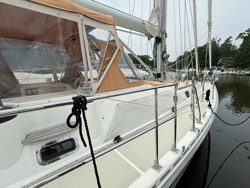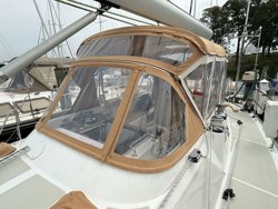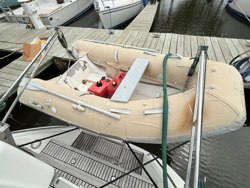 Factory installed: two additional mid-ship cleats and one centerline cleat on the stern. Varnished teak handrails on deck; Padeyes on foredeck for dinghy storage; Stainless steel wire lifelines; Stainless gate on stern; Access gates on port and starboard side with one teak/SS ladder. Stainless steel pushpit railing extended to the midship gate. Liferaft rack, stern Teak cockpit gratings - 2 each; Hot and cold deck showers hoses - in the cockpit behind the helm and at transom; Teak cockpit table; Four padeyes installed in the cockpit; Volume control for speakers located behind the helm; Drop down stern seats, port & starboard: SS portside radar pole with antenna bracket and swinging outboard lift; 3 cockpit opening ports, 2 aft cabin opening ports; Large LPG BBQ; grill gas supplied by shipboard propane system; Zodiac with canvas cover since new, Yamaha 15 hp outboard two stroke. Dinghy gear: anchor, navigation light and locks St Croix davits; 4 Praktec AERE inflatable fenders; Dock lines; Quickline flat rope and reel 250' - mounted on the side rail.