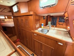 GalleyThe walkthrough galley provides a workable layout at sea and at anchor with the inboard centerline sink and outboard stove and oven. There are many amenities including front and top opening new (2023) refrigerator and freezer and custom galley sink and faucet not to mention acres of counter space and storage galore.