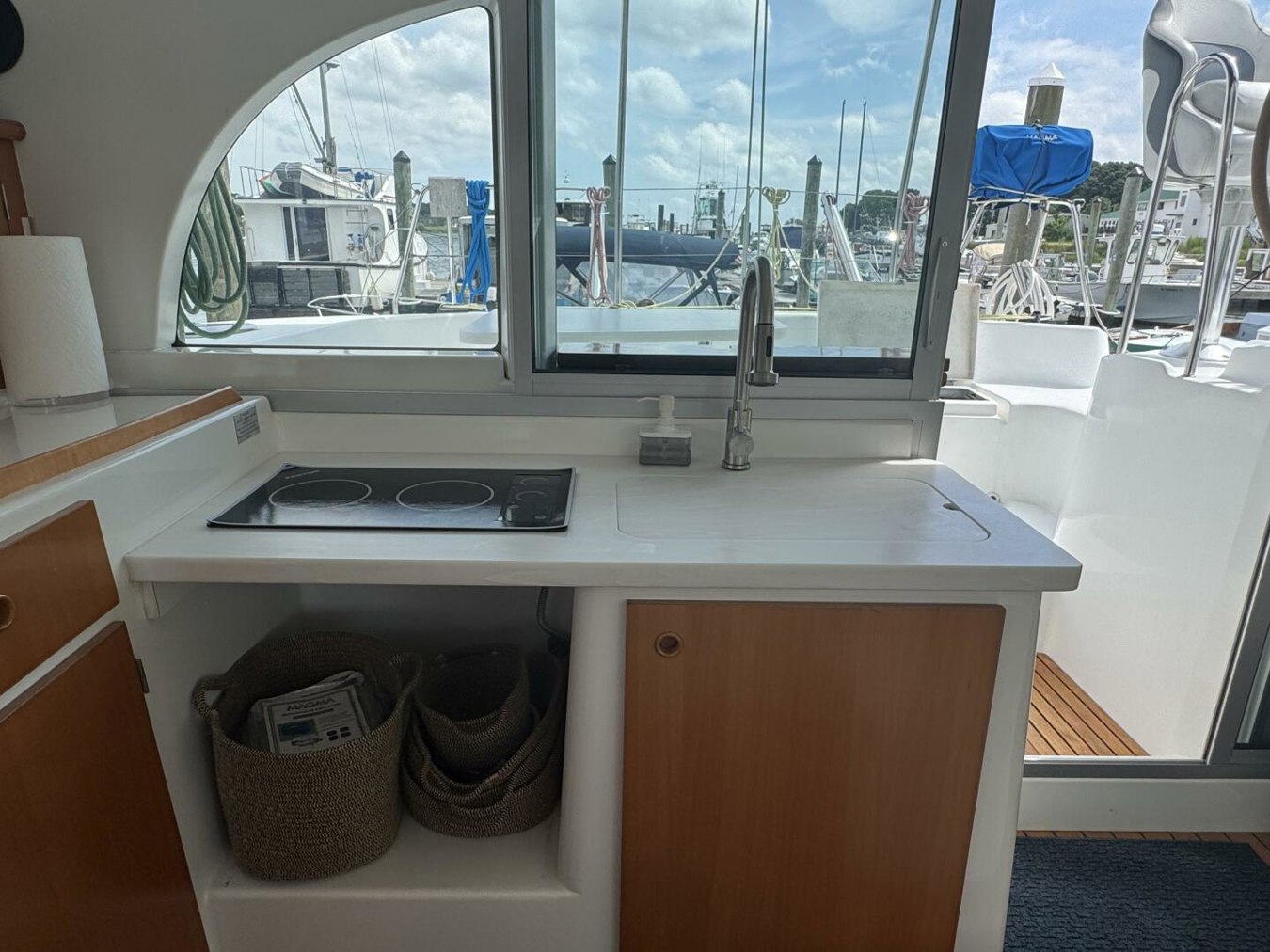 The Lagoon 380 is comfortable with her beamy hulls and headroom. The unique vertical salon windows are more shaded from the mid-day sun, lessening the “greenhouse effect” from the slanted window designs, and also allowing for amazing visibility with a 360-degree viewing from inside the salon. The dual sliding doors give the salon a very open, airy environment. The galley is equipped Kenyon Silken 21” induction cooktop (2020), an air-cooled Frigoboat fridge/freezer, and an electric pump for the galley water with a 110v 10-gallon hot water tank. There is also a water filtration system installed under the sink. There are 3 sleeping cabins with large comfortable berths and ample storage. The 2 heads each have a shower, one electric marine toilet, and one manual toilet.