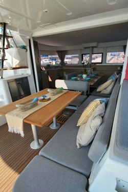Lagoon has redefined onboard living with a highly adaptable catamaran, featuring modular spaces. This innovative design allows you to easily transform the layout, merging the interior and exterior, and the saloon and cockpit, according to your preferences. The design enables various configurations, including a dining area that seats up to 12 guests.