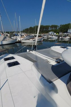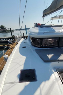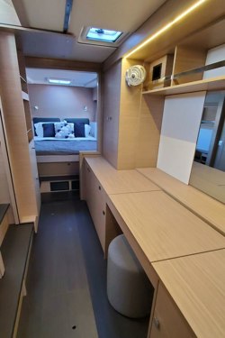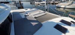 It now includes an additional aft entryway for each hull. This new feature improves access between the boat and the dock, enhancing both comfort and safety. This access point is integrated into the catamaran’s design, preserving its aesthetic while offering practical benefits. This innovation sets a new standard in yacht design, prioritizing convenience and elegance.