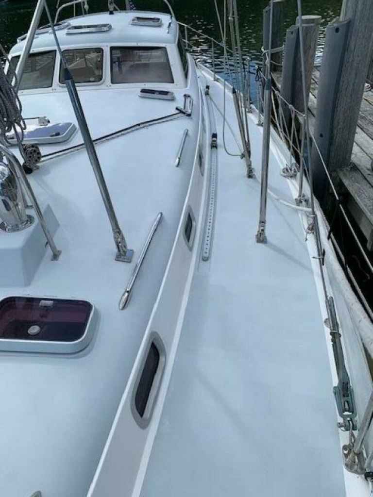 The deck is one piece molded FRP with Airex foam core for strength and stiffness. In areas where deck equipment is installed, core is replaced with high-density foam. Cockpit sides and coaming are solid fiberglass. Deck flange is solid glass. All deck hatch landings are molded FRP. The propane locker is molded separately and ventilated with direct drain overboard.