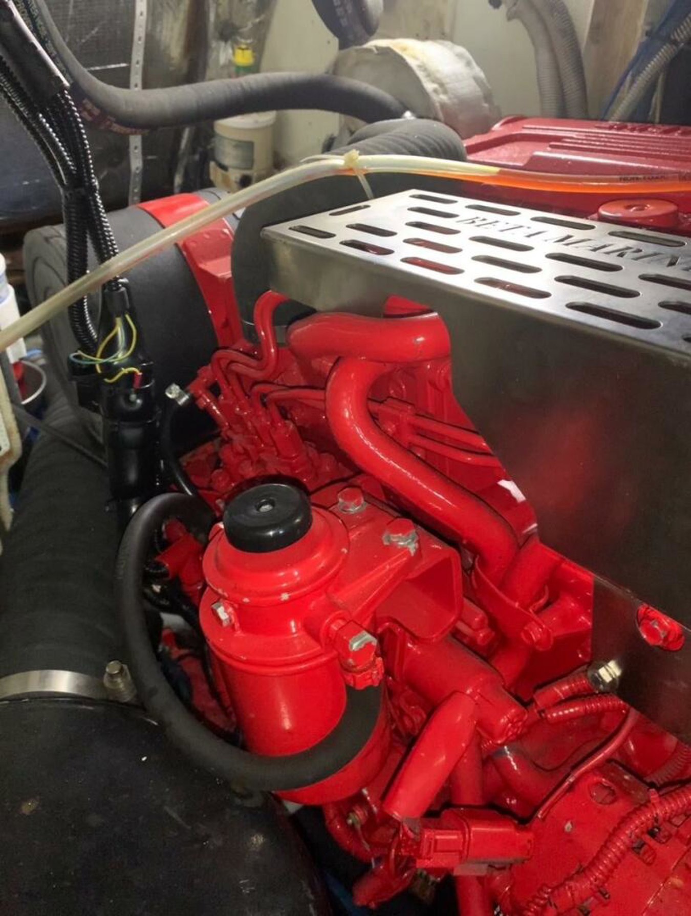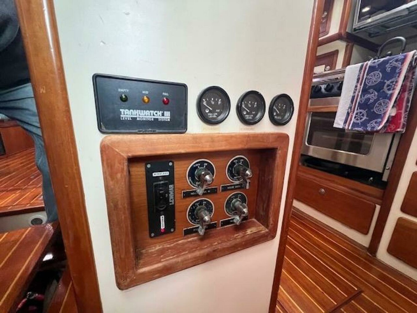 The yacht's DC electrical supply is 12 volt, supplied by (2) AGM batteries Independent 200-amp hour battery for engine starting and (2) AGM batteries for bow thruster. (All batteries replaced in 2022.) House batteries are charged by a 135-amp engine alternator and the engine battery is charged by a 55-amp alternator. Alternatively, all batteries may be charged by a Victron automatic battery charger/2000 watt inverter (new 2022) run off shore power or the generator.