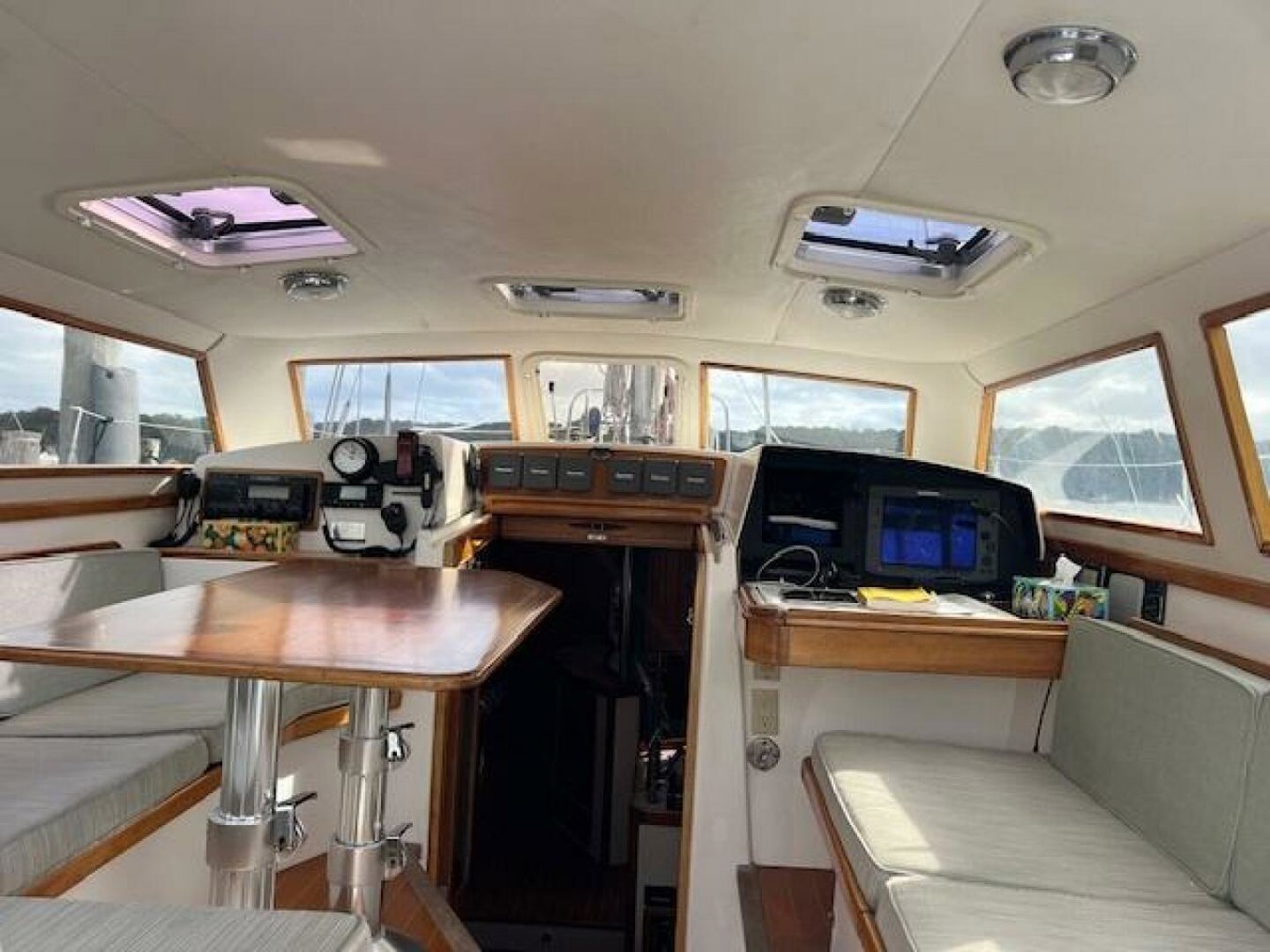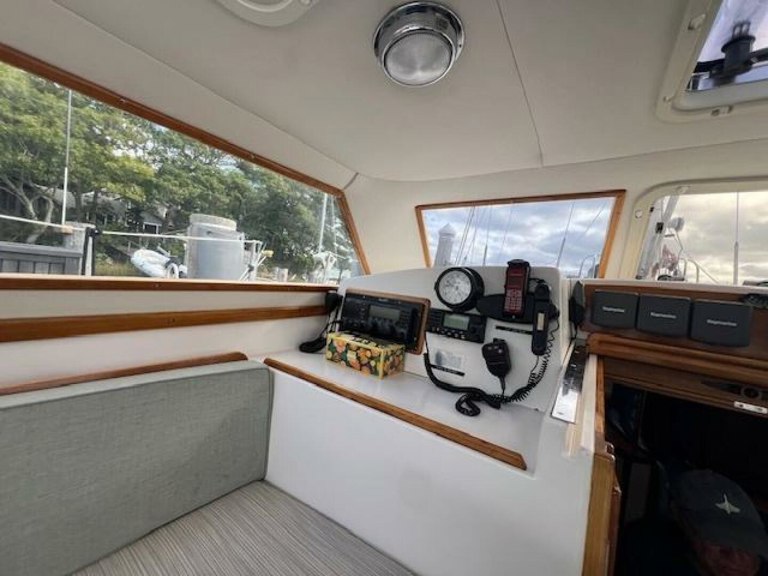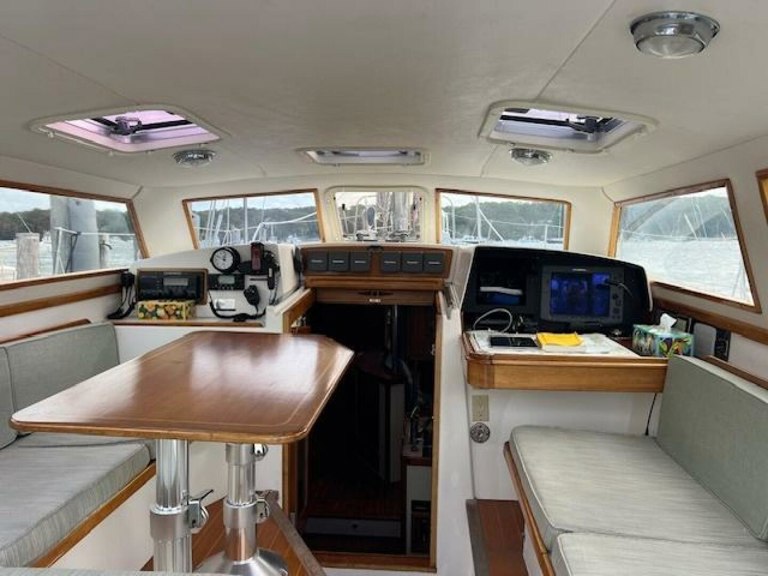 PilothouseOne step down from the main cockpit, one enters the enclosed pilothouse that features seating for up to six. There is an L-shaped settee to port with up/down varnished cherry table that can convert to an on-deck double berth with mattress filler piece. To starboard is a full-length settee with built-in nav station and varnished cherry chart table forward. This unique space is comfortable, safe from the elements, climate-controlled with heat/AC, and quite airy with superb visibility in all directions. Overhead hatches, opening front windshield and numerous fixed windows provide excellent natural light and ventilation. In good conditions, the rear curtains can be opened to provide one large indoor/outdoor living space under sail or at anchor. Secondary access to the engine room and generator is through the lift-up starboard settee.