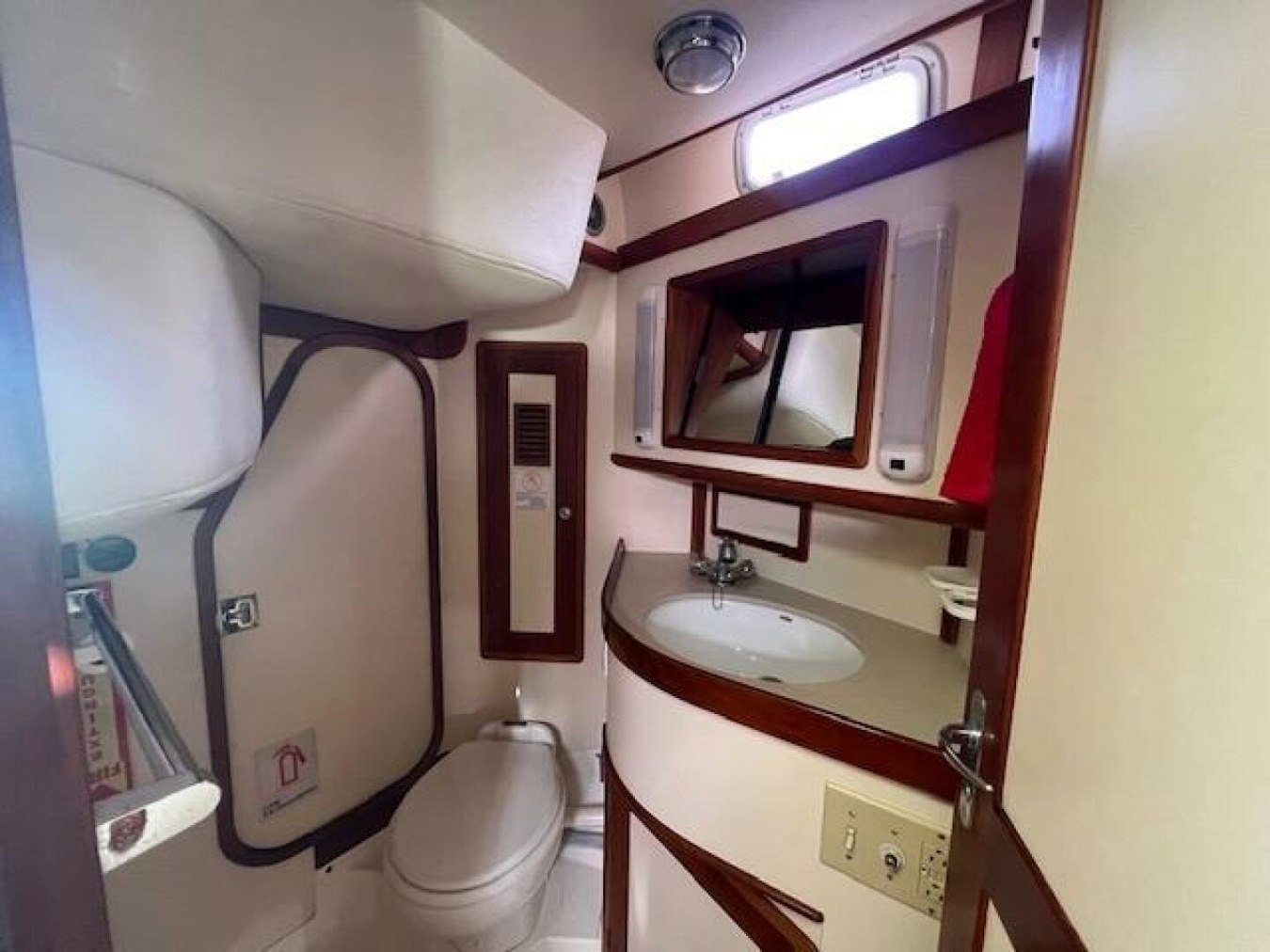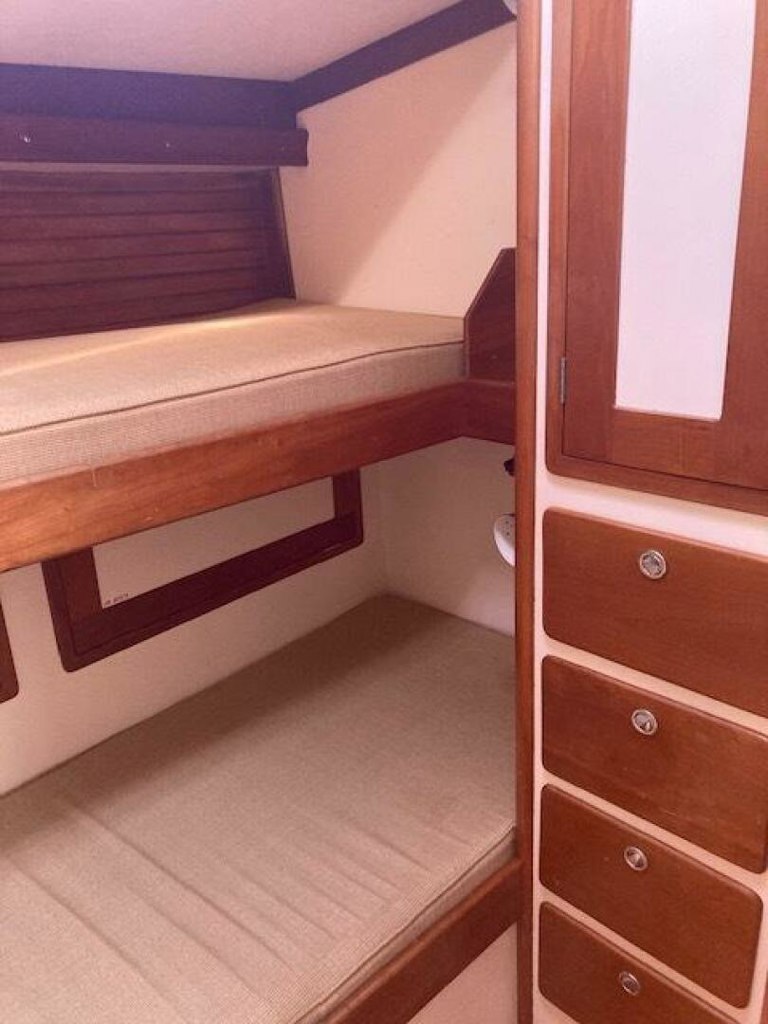 Master headroom/HeadThe master stateroom is forward, with a V-berth configuration featuring two large berths that can be converted to a double (new mattress, 2017). The cabin is unusually large for a yacht of this size and provides exceptional storage and floor area. There are bureaus each side with numerous drawers, lockers and (2) hanging lockers. A large deck hatch and (2) opening portholes provide great light and ventilation.
