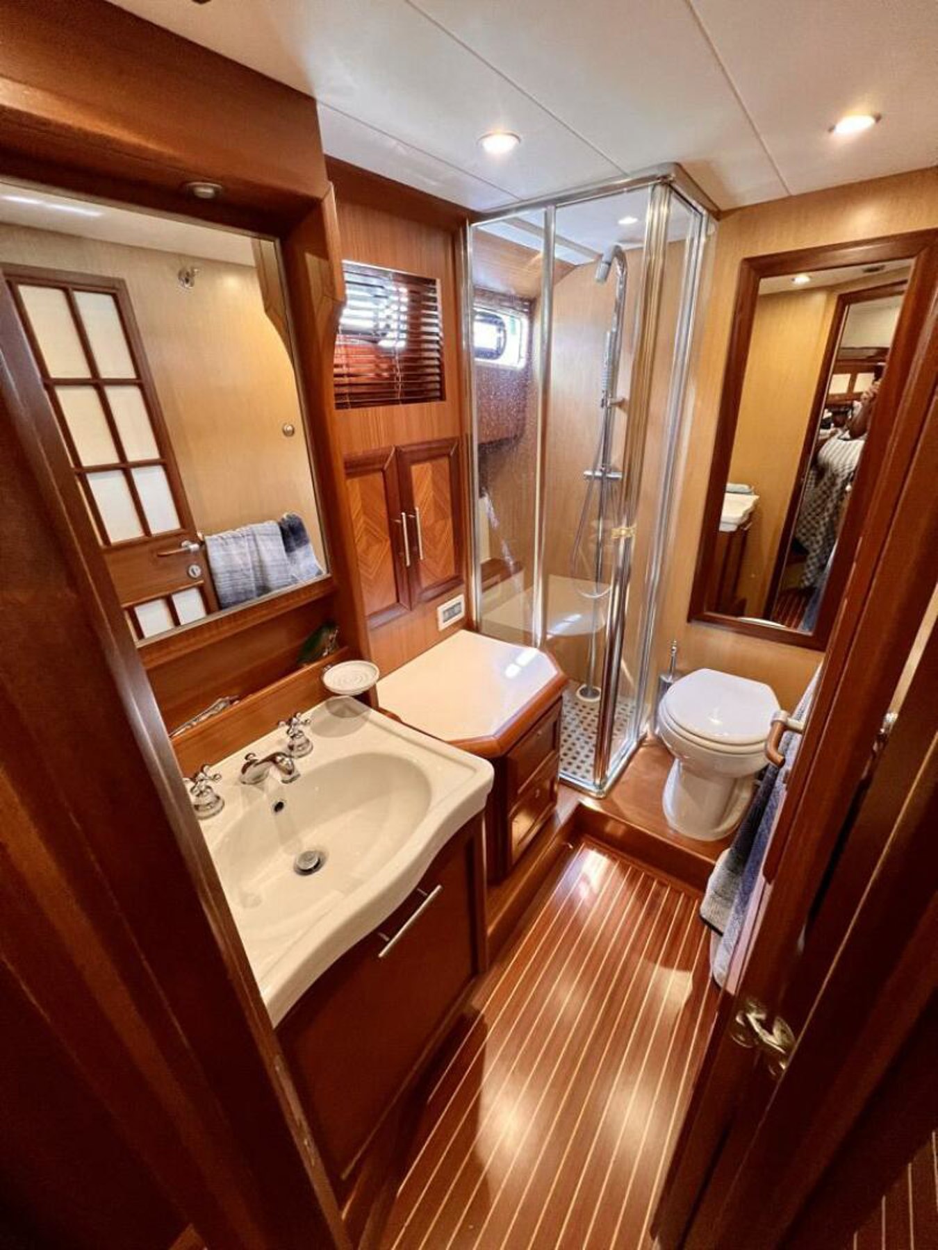 Coming aboard "Mamma Mia" through the aft cockpit door first thing noticeable is the large aft cockpit with easy access to the engine space.There is ample seating facing forward and on the port side by the sliding doors is access to the crew quarters or 3rd cabin.To starboard facing aft is the built in icemaker and stainless sink.Beautifully varnished rails make her stand out head and shoulders amongst any other boat in the harbor.