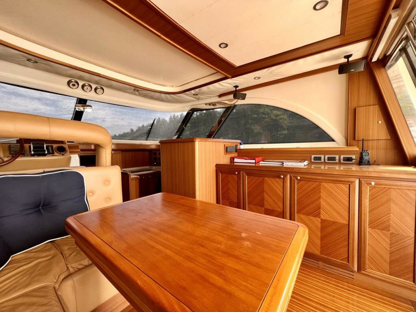 The helm station is on the port side of the vessel and the galley is to starboard. The helm has its own air conditioning controls for the pilot and a complete electronics package updated in 2023 and 2024