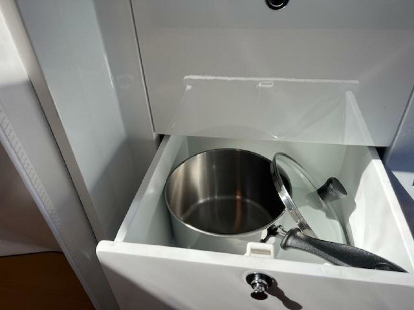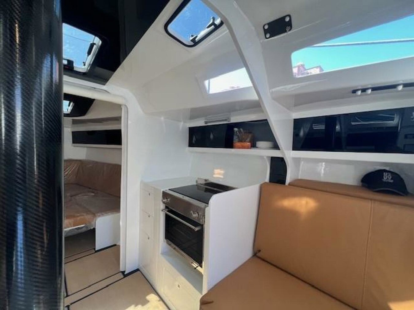 Galley is situated forward of the mast on the port side is a fridge and carbon sink with fresh water.Directly across to Starboard are 4 storage compartments and a induction stove top and oven.