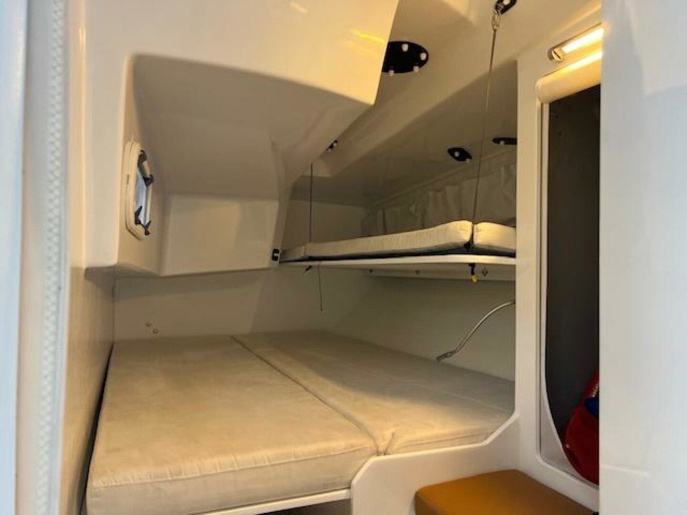 Moving forward of the galley is a large V berth with roll up Privacy panels.The centre section of the berth is removable and the table from the cockpit can be installed to be used as an office desk or for navigation purposes.The 2 aft cabins are a mirror image of each other with a large double bunk and a pipe cot in each.(please note the berths have never been slept in).The freshwater custom carbon head is located to starboard and to port is a large shower and vanity unit.