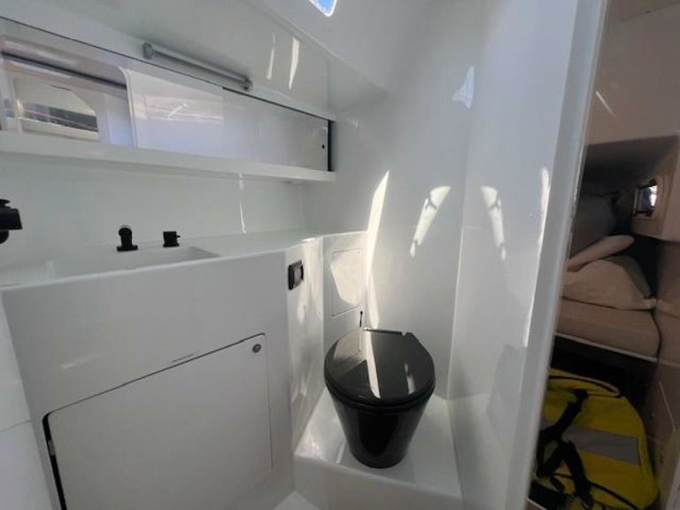 .Going down 5 Carbon steps the cabin is bright and airy thanks to numerous windows and opening hatches.All exposed moulded surfaces are painted in a white gloss finish.Cabin soles are composite construction and covered in a tanned sea deck material. Along the centre line is a white painted carbon table that can easily accommodate 6 for dinner.Port and starboard couch's on either side with abundance of storage under and behind each seating area.Under the starboard settee is the water maker and freshwater tank. Under the port settee is the water ballast pump mechanics for the lifting keel,
