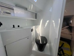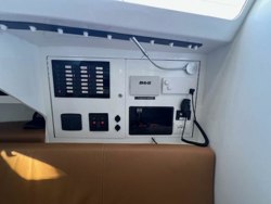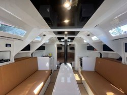 .Going down 5 Carbon steps the cabin is bright and airy thanks to numerous windows and opening hatches.All exposed moulded surfaces are painted in a white gloss finish.Cabin soles are composite construction and covered in a tanned sea deck material. Along the centre line is a white painted carbon table that can easily accommodate 6 for dinner.Port and starboard couch's on either side with abundance of storage under and behind each seating area.Under the starboard settee is the water maker and freshwater tank. Under the port settee is the water ballast pump mechanics for the lifting keel,