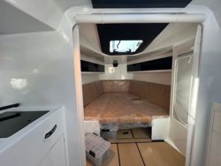 Galley is situated forward of the mast on the port side is a fridge and carbon sink with fresh water.Directly across to Starboard are 4 storage compartments and a induction stove top and oven.