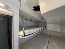 Moving forward of the galley is a large V berth with roll up Privacy panels.The centre section of the berth is removable and the table from the cockpit can be installed to be used as an office desk or for navigation purposes.The 2 aft cabins are a mirror image of each other with a large double bunk and a pipe cot in each.(please note the berths have never been slept in).The freshwater custom carbon head is located to starboard and to port is a large shower and vanity unit.