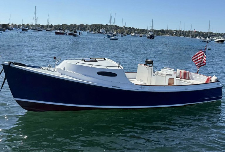 Introducing Kaymar, a 1996 Old Port Marine 26 center console launch, custom fit for enjoyment as a “picnic boat” or open cockpit recreational launch. Kaymar has a full keel, semi displacement hull with classic Down-east style featuring a high flared entry, built-in spray rails, and a wide 9’2” beam carrying back to the transom. The design makes her roomy, stable in choppy seas, highly maneuverable (she can be turned, either direction, in a boat length), and easy to drive. The high shear forward, gracefully tapers to a low shear aft, giving her stability and providing passengers’ easy access to the water, docks, and rafts.