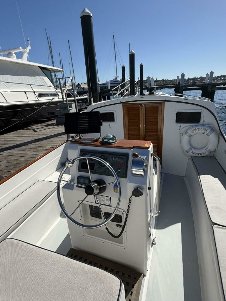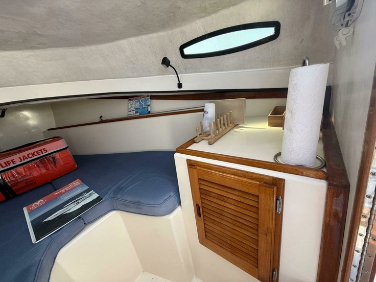 Kaymar is equipped with far more than the essential features. She has a cuddy forward with a vee-berth and cushions, LED reading lights, storage shelves with teak trim port and starboard, tool storage locker, two storage cabinets with teak doors and counters, one with a spigot for 6.5-gallon freshwater container in the cabinet under. Four portholes and Lewmar hatch, with screen, provide ventilation and lots of light. The lockable teak cuddy entry doors provide secure storage and privacy for the portable head stowed under the cockpit. Two aft cockpit scuppers and an automatic bilge pump help keep the deck and the bilge dry.