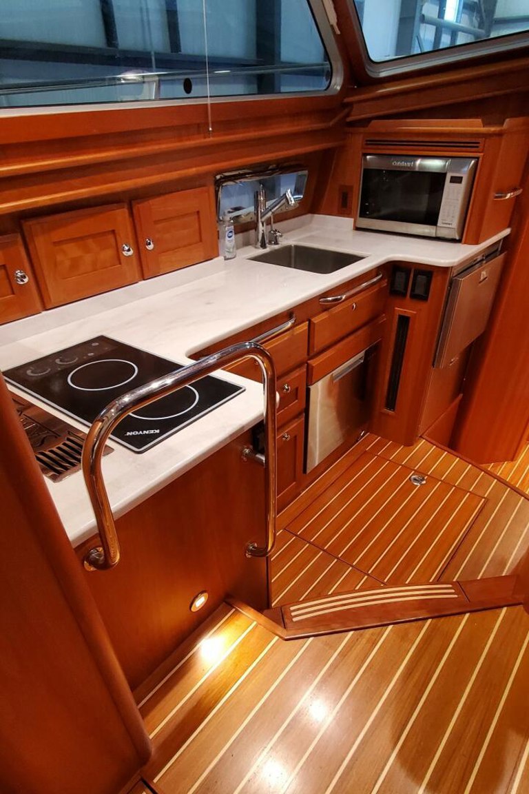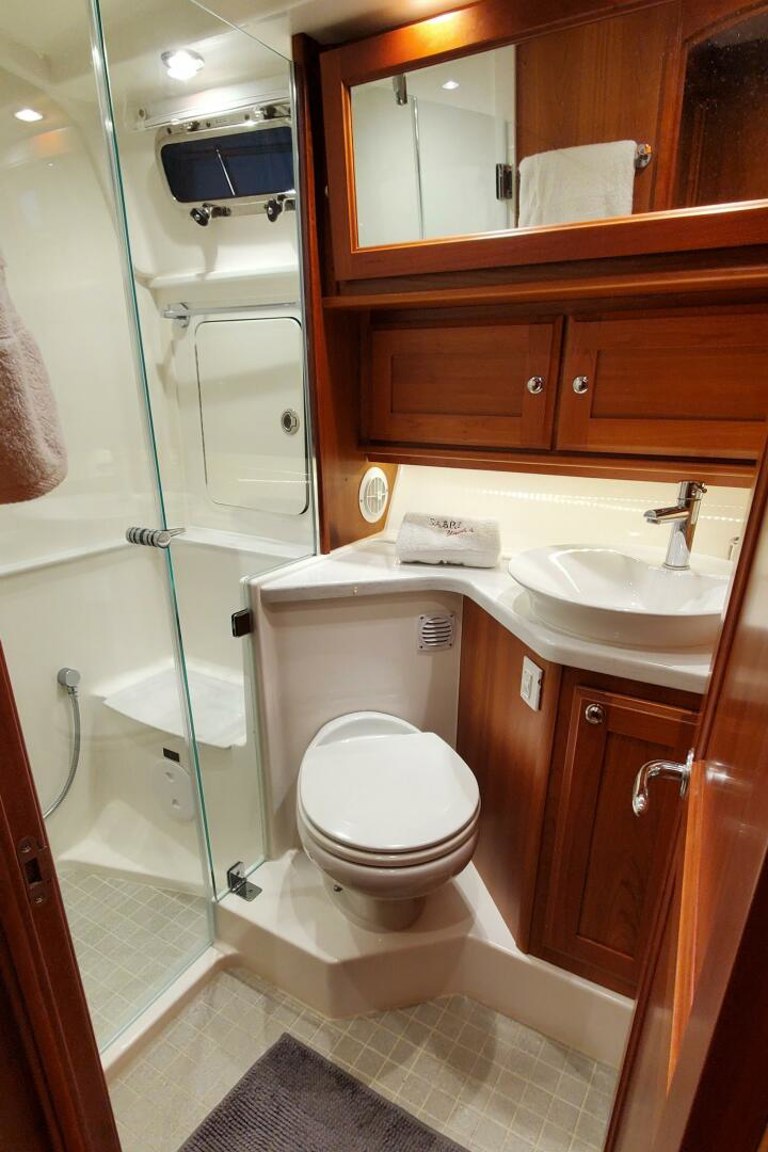 The Sabre 45 Salon Express is equipped with advanced features, including joystick control for effortless navigation, a full suite of Garmin Electronics, Spectra Watermaker, Seakeeper 6, 11.5Kw Onan generator, Solar Panels, Starlink and a Freedom Lift with a 10’6″ AB RIB and much, much more