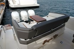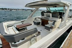 She features multiple, easily accessible social zones, perfect for friends and families to enjoy various water activities, outdoor grilling, dining, and lounging. Relax on the convertible sun pad, in the elegant cabin, or in the aft cockpit areas. The wrap-around forward bow seating provides additional space to unwind and enjoy time on the water with loved ones.