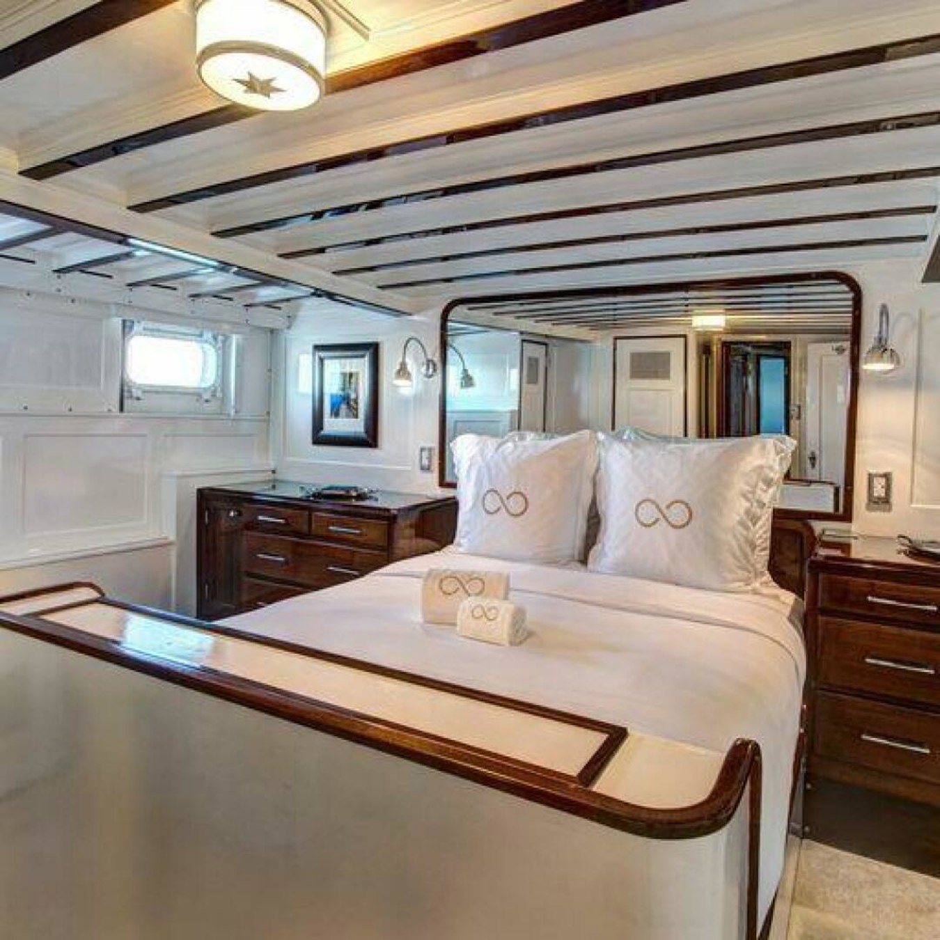 Master Stateroom is generously appointed and located aft featuring a queen size centerline bed with a custom-built frame that includes a footboard that houses a built-in flat-screen television that raises through a hidden panel when in use & lowers to hide away when not in use. The queen bed replaced the yacht’s original twin port and starboard berths and is flanked by period bedside reading lamps. There are hanging lockers are located on either side of the bed, with twin aft bulkhead dressers and twin bench seats offer additional storage and an aft bulkhead mirror lies above the queen berth. The master has 4 opening ports with sliding shutters allows the option to have fresh air to circulate freely as an alternative to the air conditioning, and the large mirror reflects light and provides an open and airy atmosphere within the stateroom. For safety there are hard wired smoke & carbon monoxide detectors.