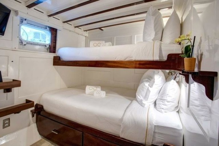Exiting the twin stateroom and moving forward to port, a third cabin features upper and lower bunks with a shared day head.